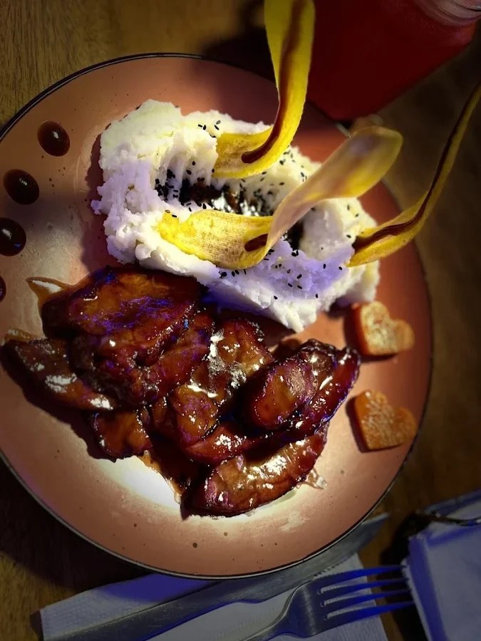 GANADOR RETO SAZON 2022🥇. Nuestro plato estrella, referente de La Shiraka. Bondiola de cerdo horneada AL BARRIL, glaseada en reducción de tamarindo, acompañada de pepinillos agridulces, chips de platano y puré de la abuela