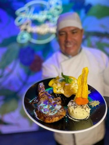 Es Gigante!!! Un imperdible si vienes a La Shiraka. Chuletón de cerdo a la plancha acompañado de ensalada de piña con queso, manzana, apio, en una canasta crujiente de plátano y puré artesanal de la casa.