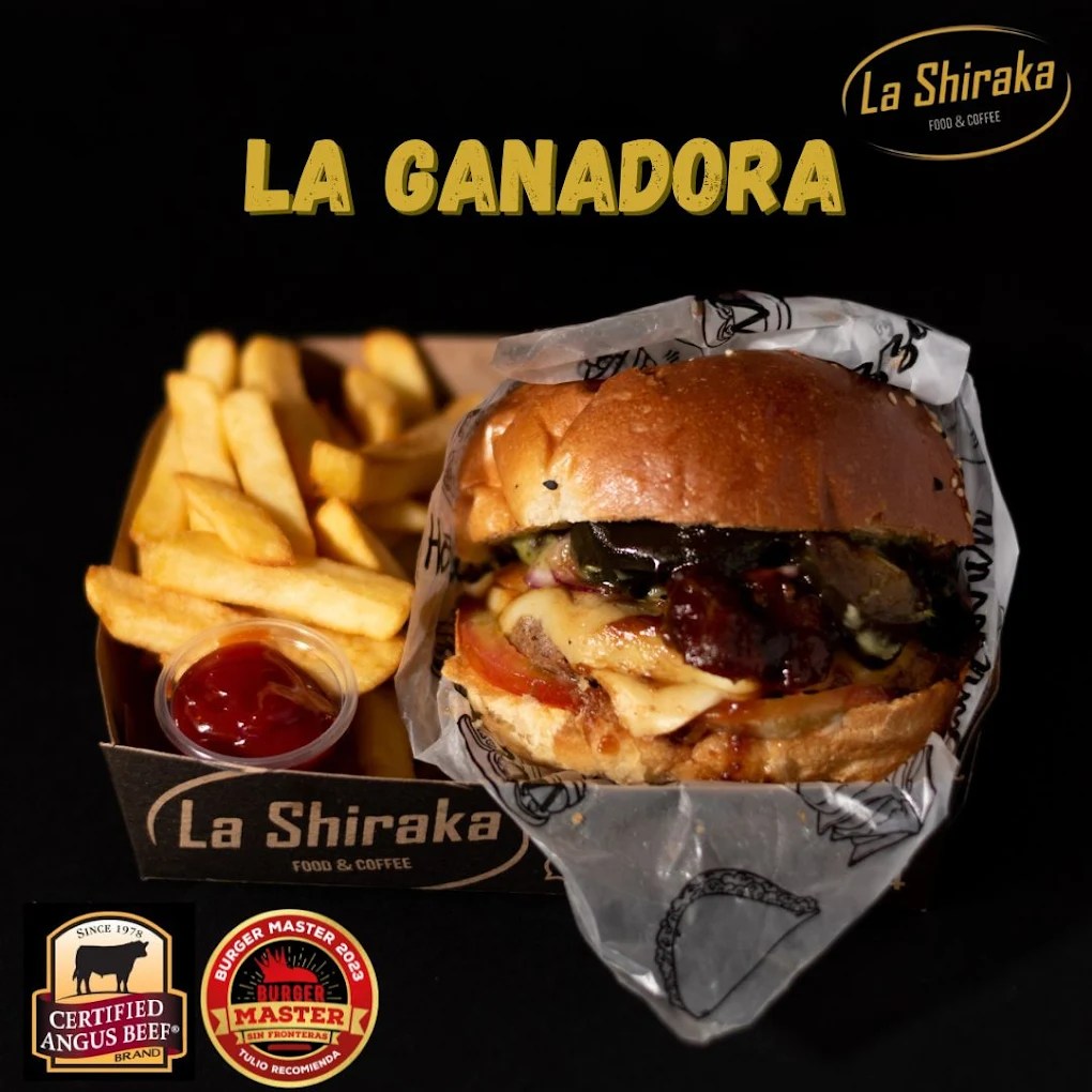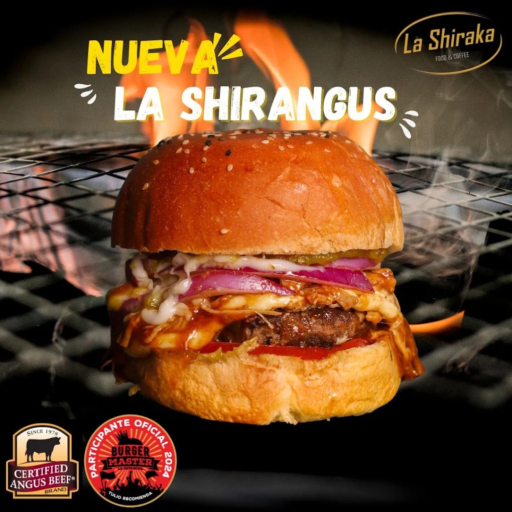 BURGER MASTER 2024. 💯 CERTIFIED ANGUS BEEF. Con queso americano fundido, salsa verde agridulce especial de la casa, pierna de cerdo desmechada en salsa BBQ artesanal, tomate y cebolla morada (Opcional)