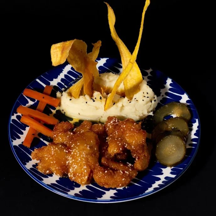 GANADOR RETO SAZON 2023🏆. Un plato distinto a los que hayas llegado a probar. Trozos de pollo glaseados en reducción de mandarina y jengibre, acompañados de pepinillos agridulces y bastones de zanahoria